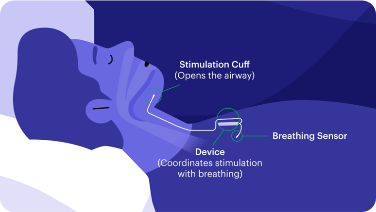 Inspire works inside your body with your natural breathing process to treat obstructive sleep apnea. While you sleep, Inspire delivers mild stimulation to key airway muscles, allowing the airway to remain open. The Inspire system is controlled by a small handheld sleep remote. You turn Inspire on before bed and off in the morning when you wake up.